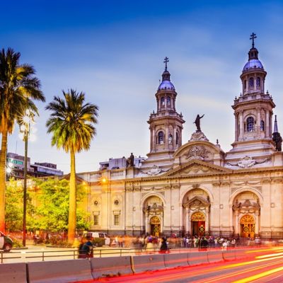 Prima colazione in hotel. Al mattino, trasferimento in aeroporto. Volo di linea per Santiago. Arrivo e trasferimento in hotel. Cena e pernottamento.