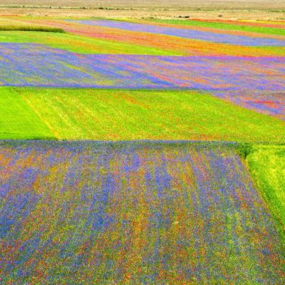 Uno spettacolo che si rinnova ogni anno con colori, luci, profumi incredibili e avvolgenti. Sull’altopiano di Castelluccio, dove la fioritura spontanea di fiori come genzianella, narciso, ranuncolo, papavero, violette, cresce tra i campi di lenticchie, trasformando il paesaggio in un’opera d’arte.